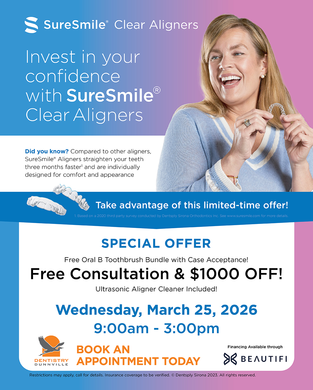 Invest in your confidence with SureSmile® Clear Aligners and enjoy straighter teeth with this limited-time offer:
